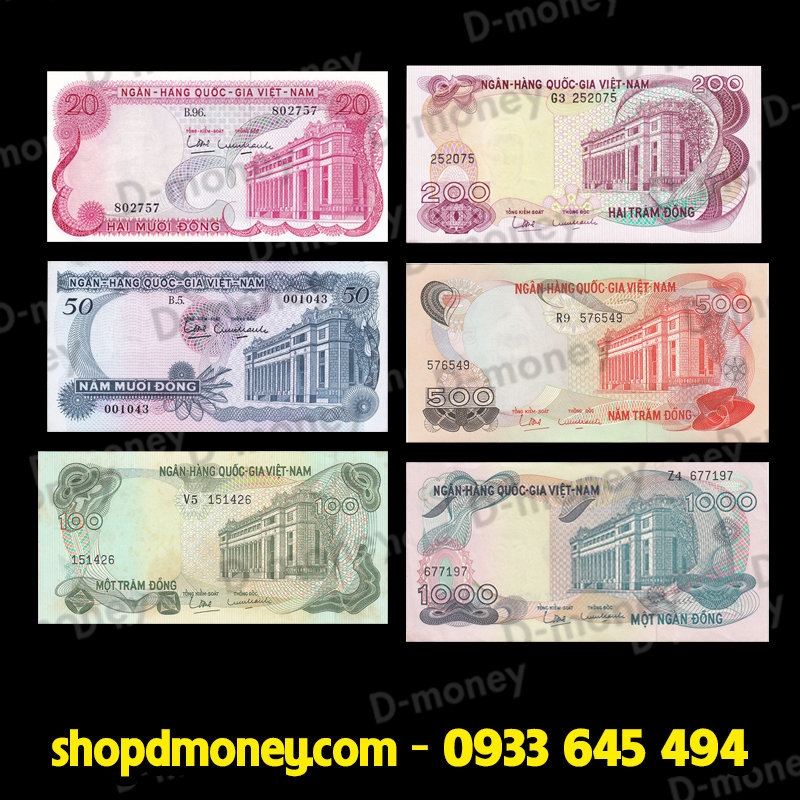 Bộ tiền hoa văn VNCH 1969 bao gồm 6 mệnh giá 20 đồng, 50 đồng, 100 đồng, 200 đồng, 500 đồng, 1000 đồng. Trong đó 20 đồng, 50 đồng được in tại nhà in Bradbury Wilkinson. Còn 100 đồng, 200 đồng, 500 đồng, 1000 đồng thì in tại nhà in Thomas de Larue.