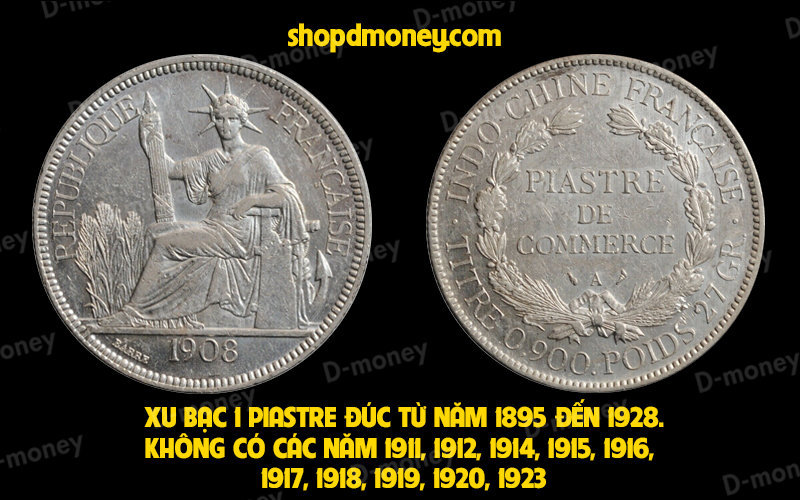 Tiền xu Đông Dương 1908 được đúc bằng bạc 90%. Nó được gọi là xu bạc hoa xòe, cũng có giá trị nhất định. Xu bạc Đông Dương 1 piastre được đúc từ năm 1895 đến 1928, KHÔNG có các năm 1911, 1912, 1914, 1915, 1916, 1917, 1918, 1919, 1920, 1923. Do đó nếu bạn đang sở hữu xu bạc 1 piastre Đông Dương mà ngoài những năm trên thì 100% là giả (trước 1895 và sau 1928). Xu bạc Đông Dương có giá khá cao nhưng cũng bị làm giả rất nhiều, do đó nếu bạn là người sưu tầm thì sẽ đóng “học phí” khá nhiều cho xu bạc giả.