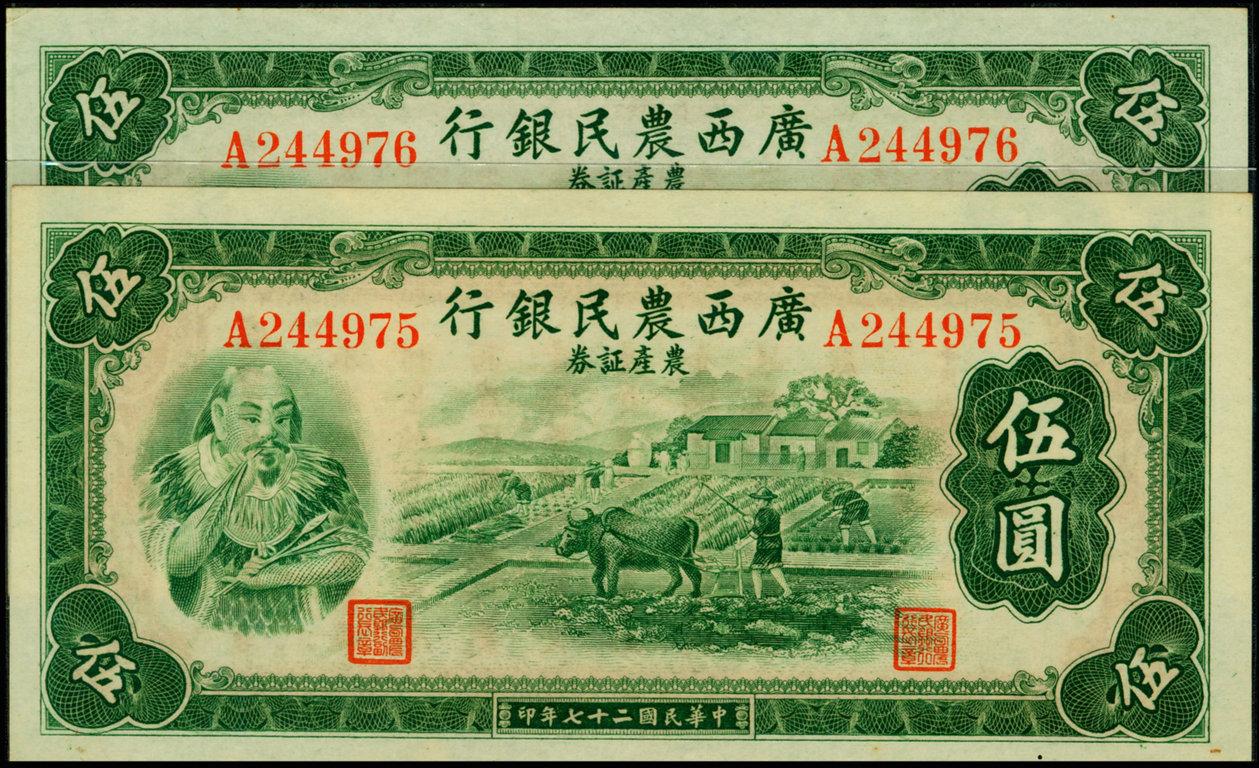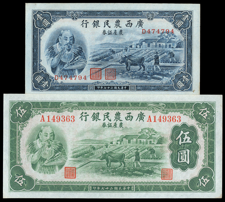 Tờ 5 yuan của Ngân Hàng Nông Dân Quảng Tây 1938 có hình Thần Nông (Viêm Đế)