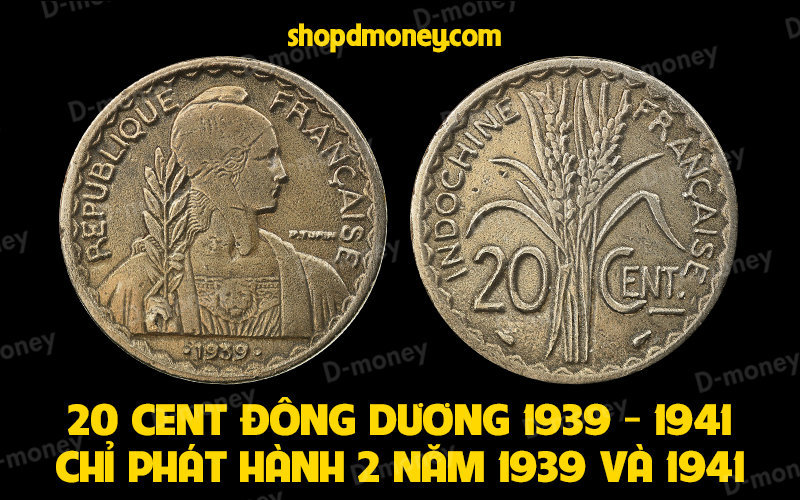 Xu 20 cent Đông Dương này chỉ phát hành 2 năm 1939 và 1941, chất liệu copper - nickel.