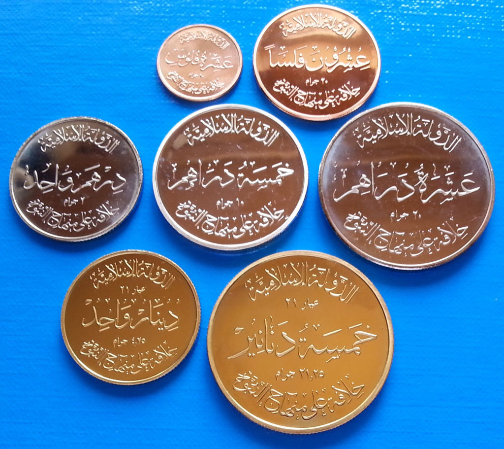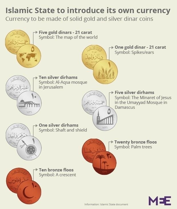 Mệnh lệnh được ban hành bởi thủ lĩnh Abu Bakr al-Baghdadi – kẻ đứng đầu tổ chức IS, phát hành 7 đồng xu có giá trị khác nhau gồm đồng dinar (4,25gr vàng), đồng dirham (2,975gr bạc) và đồng fils (0,496gr đồng).